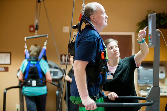 | Jim Horrocks, assisted by physical therapist Christine Montes, exercises on a treadmill while wearing a stabilizing harness at Life Care Center of Elkhorn.(Photo by Rebecca S. Gratz/The World-Herald) |